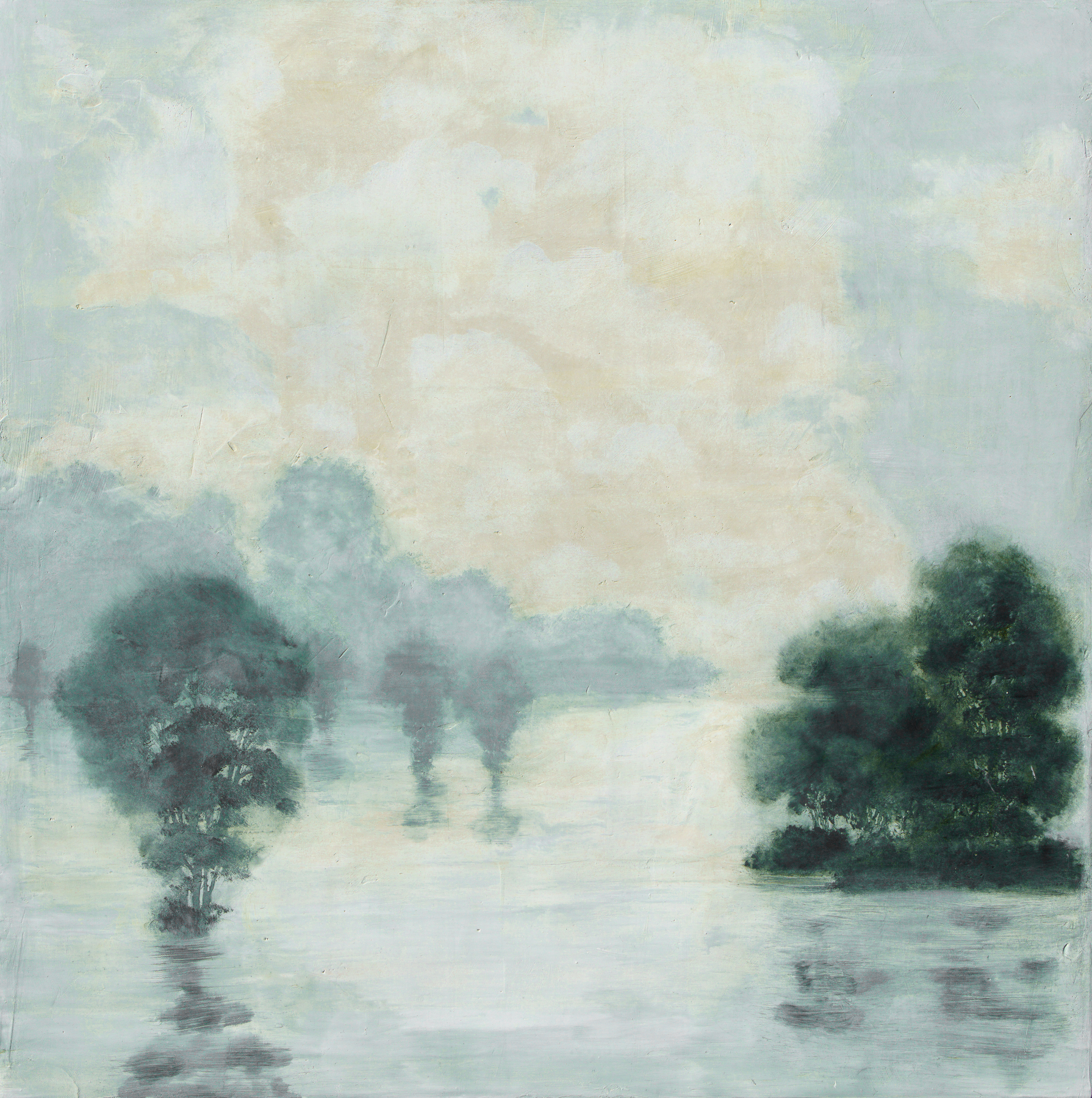 Working on birch panels, Terrell builds surfaces with plaster, polished layers, oil paint, and translucent glazes, creating luminous, richly textured paintings. As Terrell has said, “These idealized landscapes are fictional places intended to be universally familiar to the viewer, a present moment in time.”