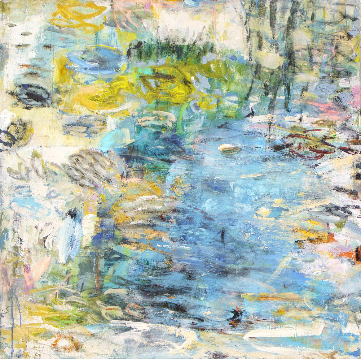 Her approach was deeply intuitive, favoring suggestion over detail. As she worked and reworked each canvas, images would emerge only to recede again, later resurfacing in new forms. This layered process involved the continual burial and revelation of imagery—paint wiped away, words obscured, surfaces peeled back—each action revealing the evolving composition beneath.