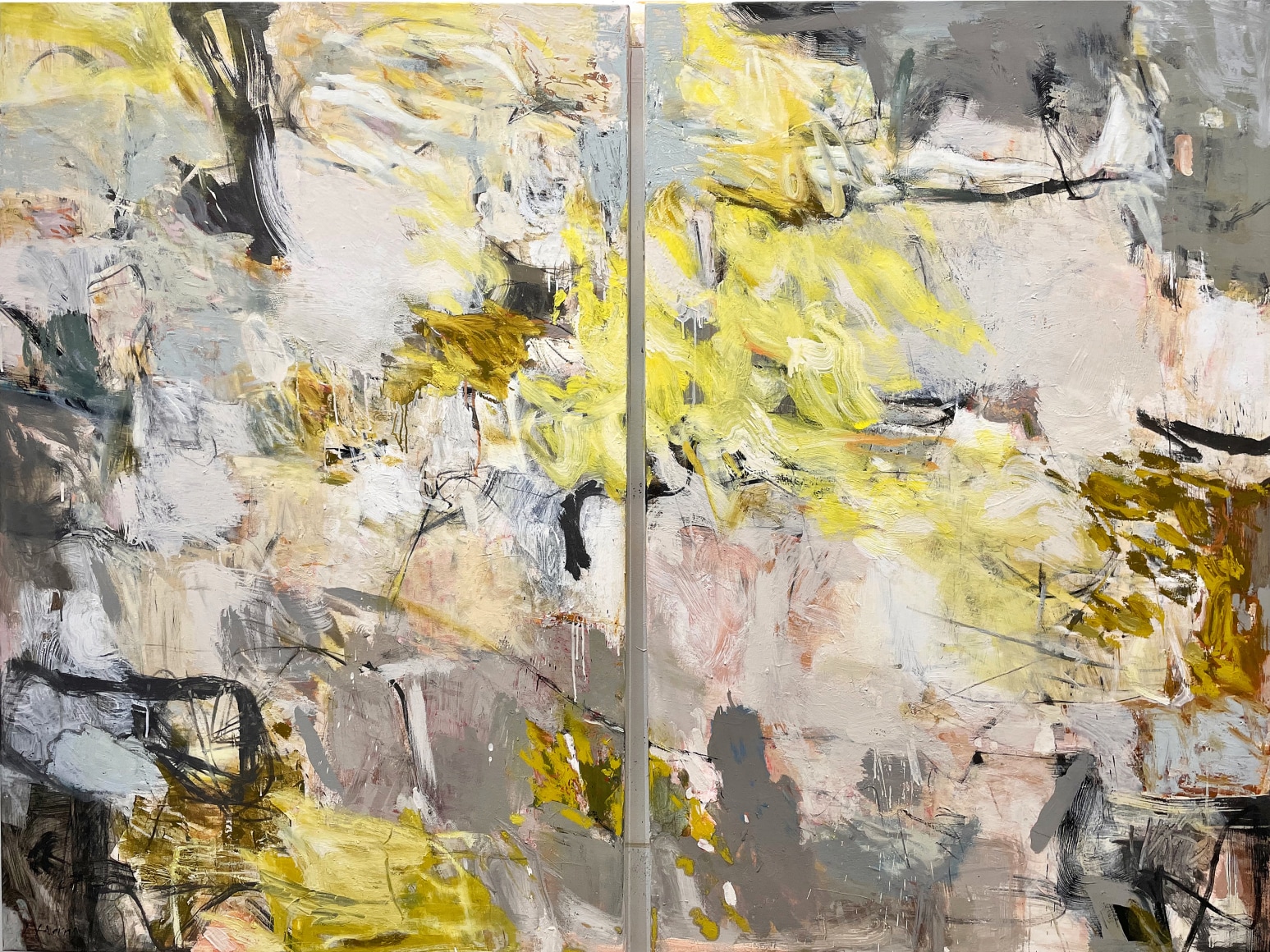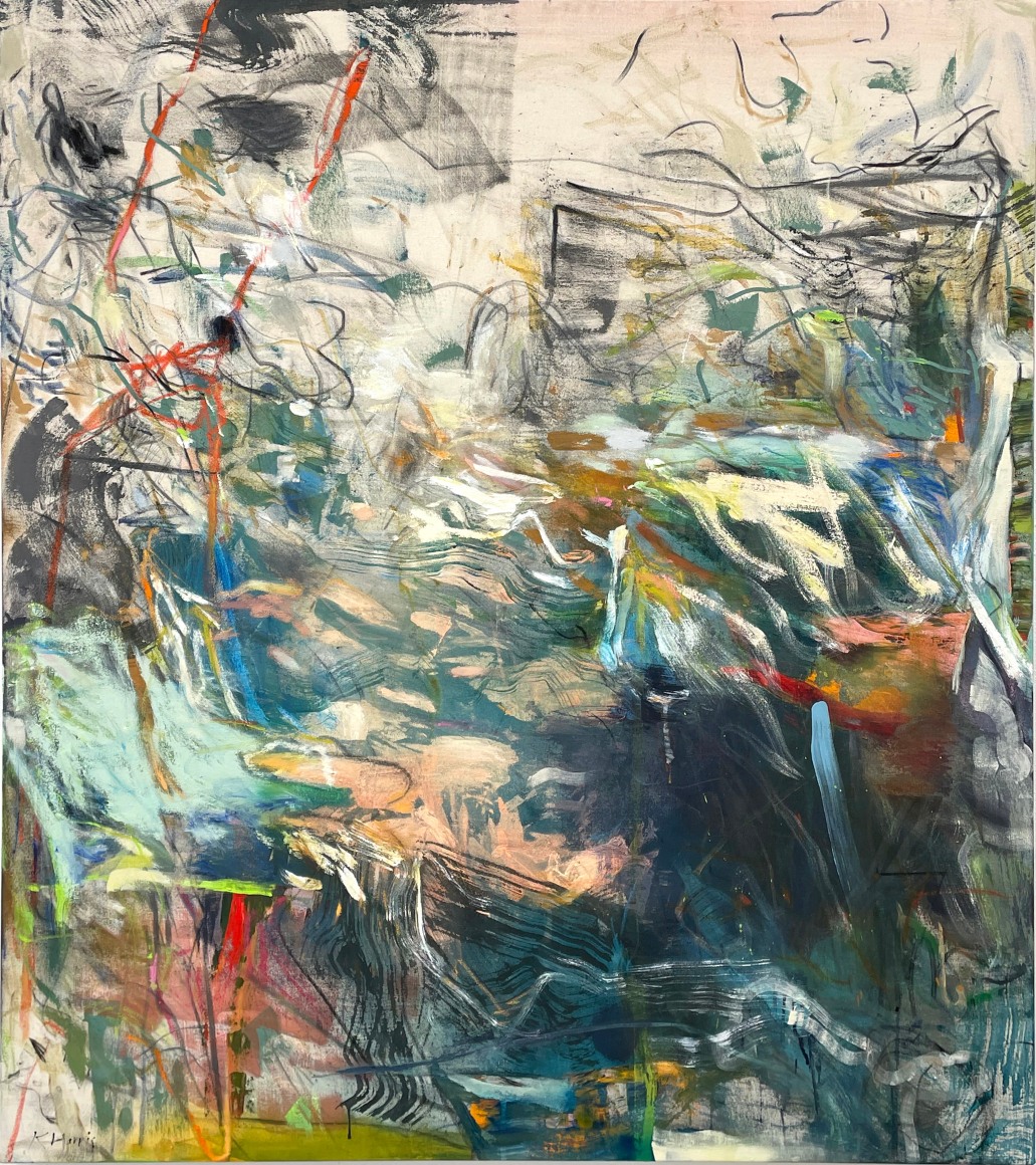 The process behind Harris’s work is as layered as her paintings. Extensive preparation, from researching and mixing pigments to experimenting with tools and techniques, lays the foundation for her dynamic approach. Risk and uncertainty are central to her method, allowing her to embrace unexpected directions and discoveries.