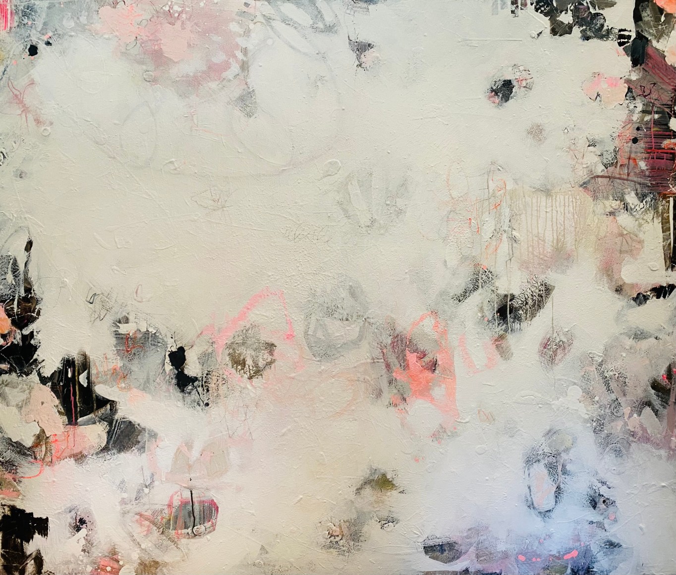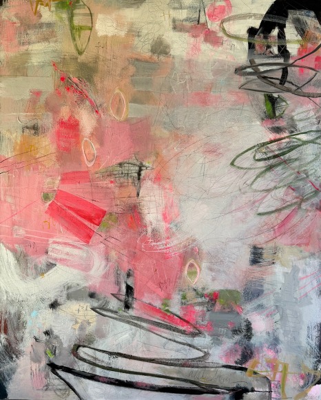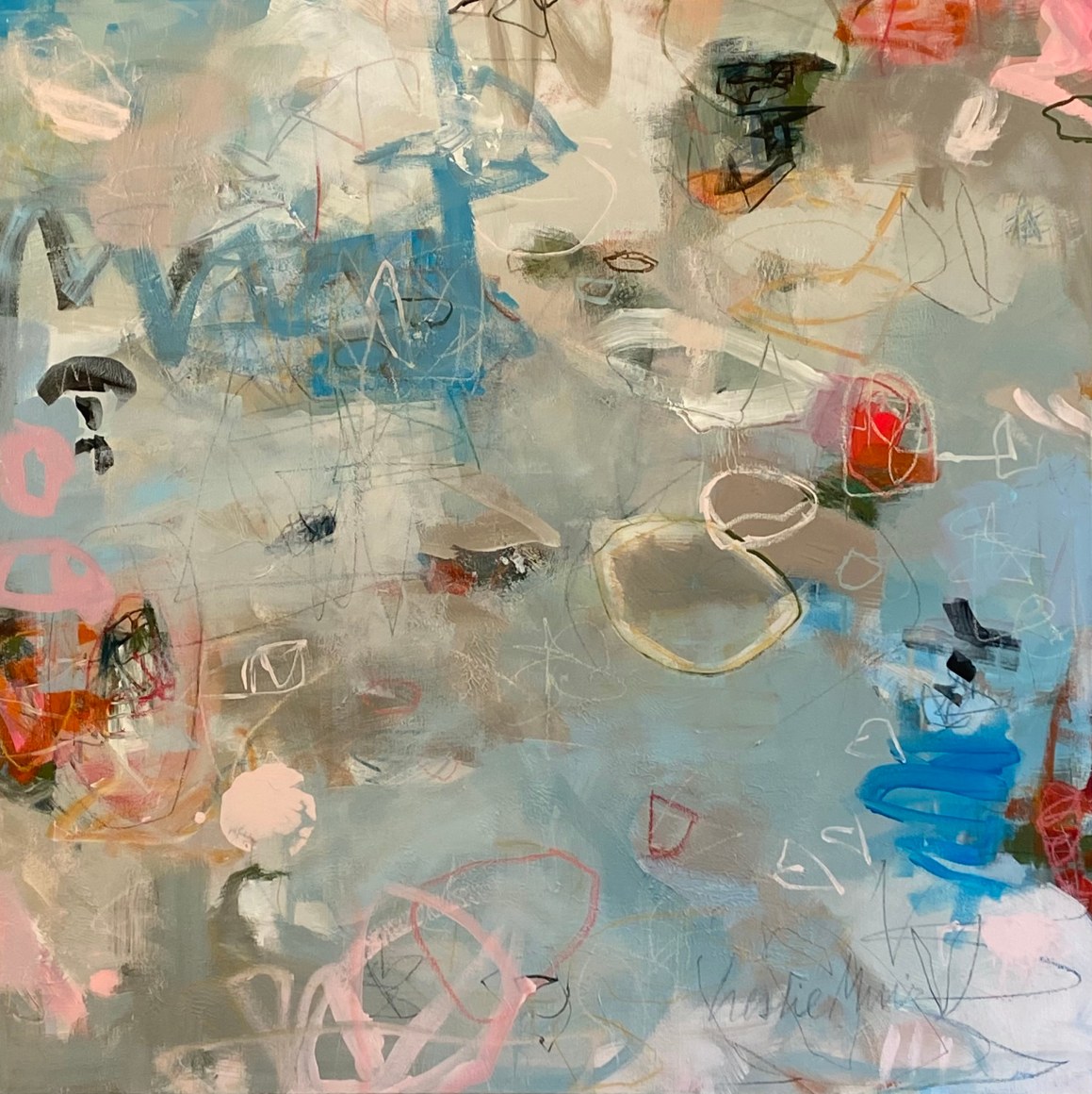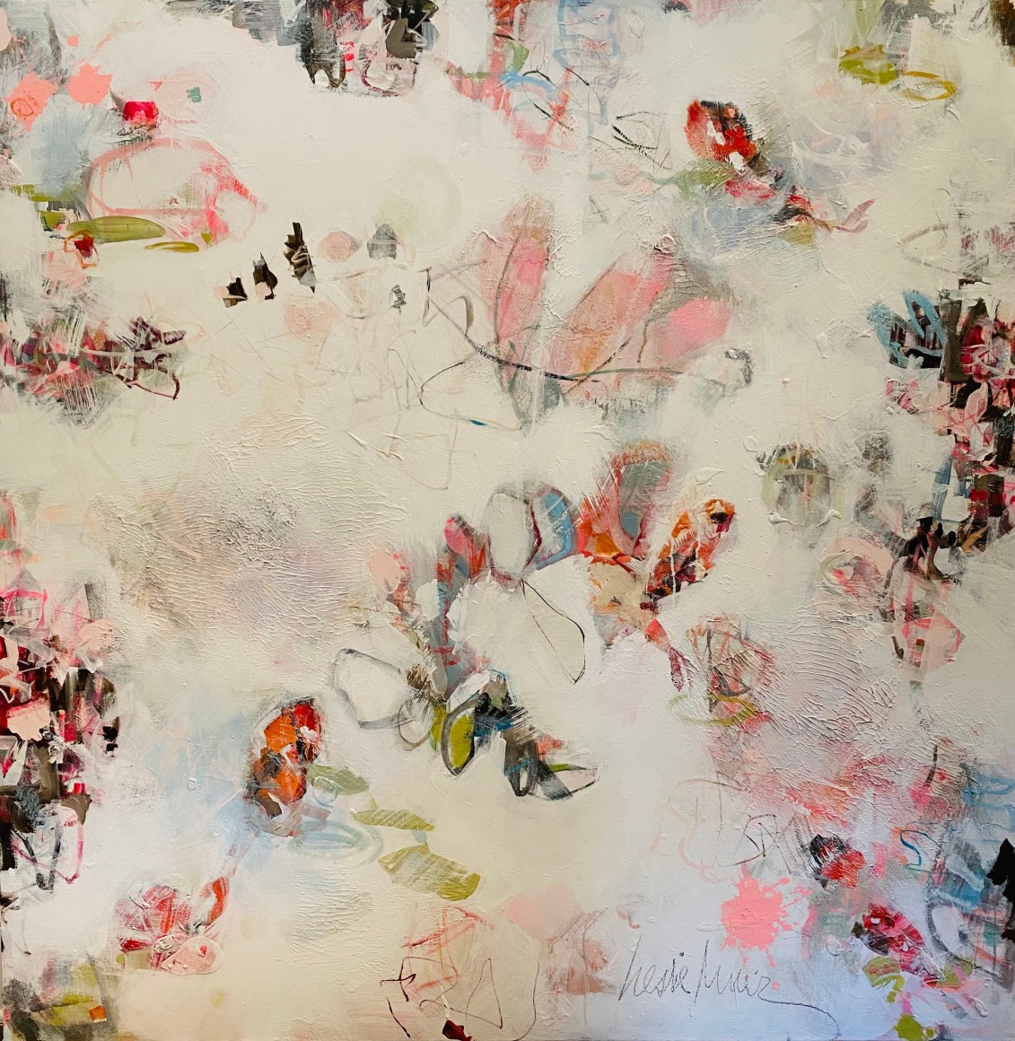 When creating abstract works, Muir embraces an intuitive process, working loosely with fluid media that often leads to unpredictable results. She welcomes these accidental effects, letting them guide the development of each piece. This experimental approach often involves repeatedly painting over sections, creating layers of color, texture, and impasto brushwork that enrich the final composition with depth and history.