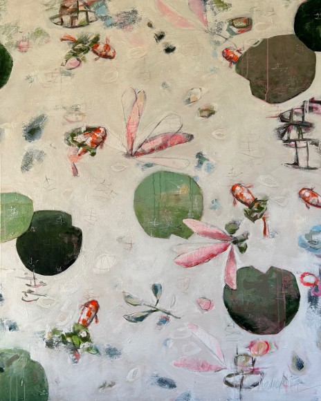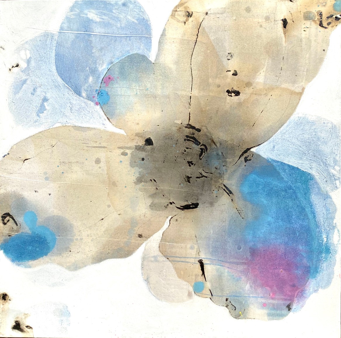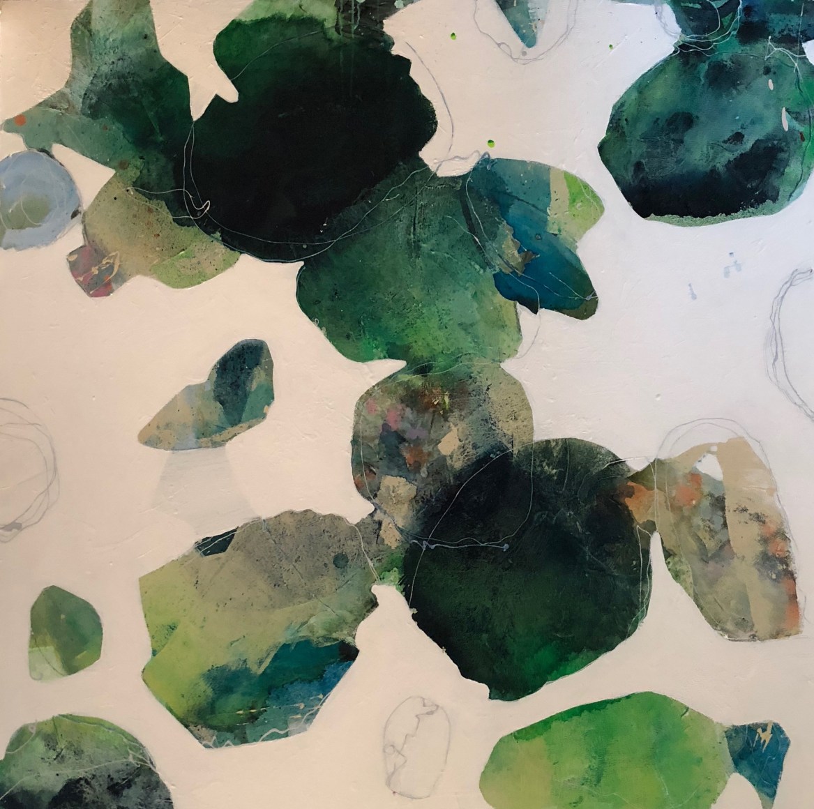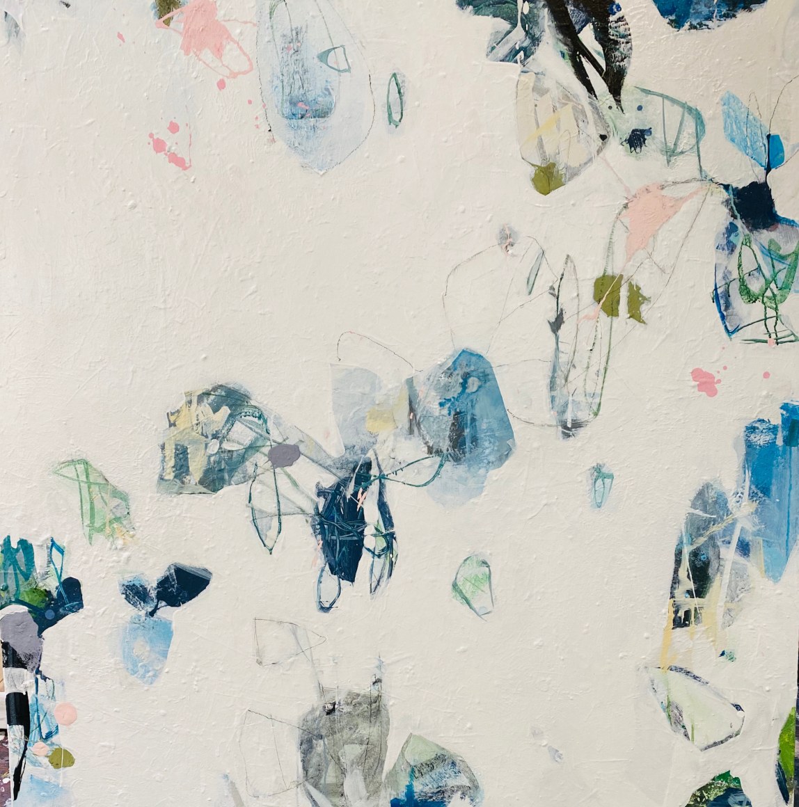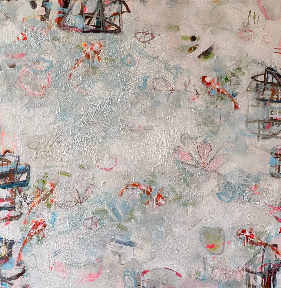 When creating abstract works, Muir embraces an intuitive process, working loosely with fluid media that often leads to unpredictable results. She welcomes these accidental effects, letting them guide the development of each piece. This experimental approach often involves repeatedly painting over sections, creating layers of color, texture, and impasto brushwork that enrich the final composition with depth and history.