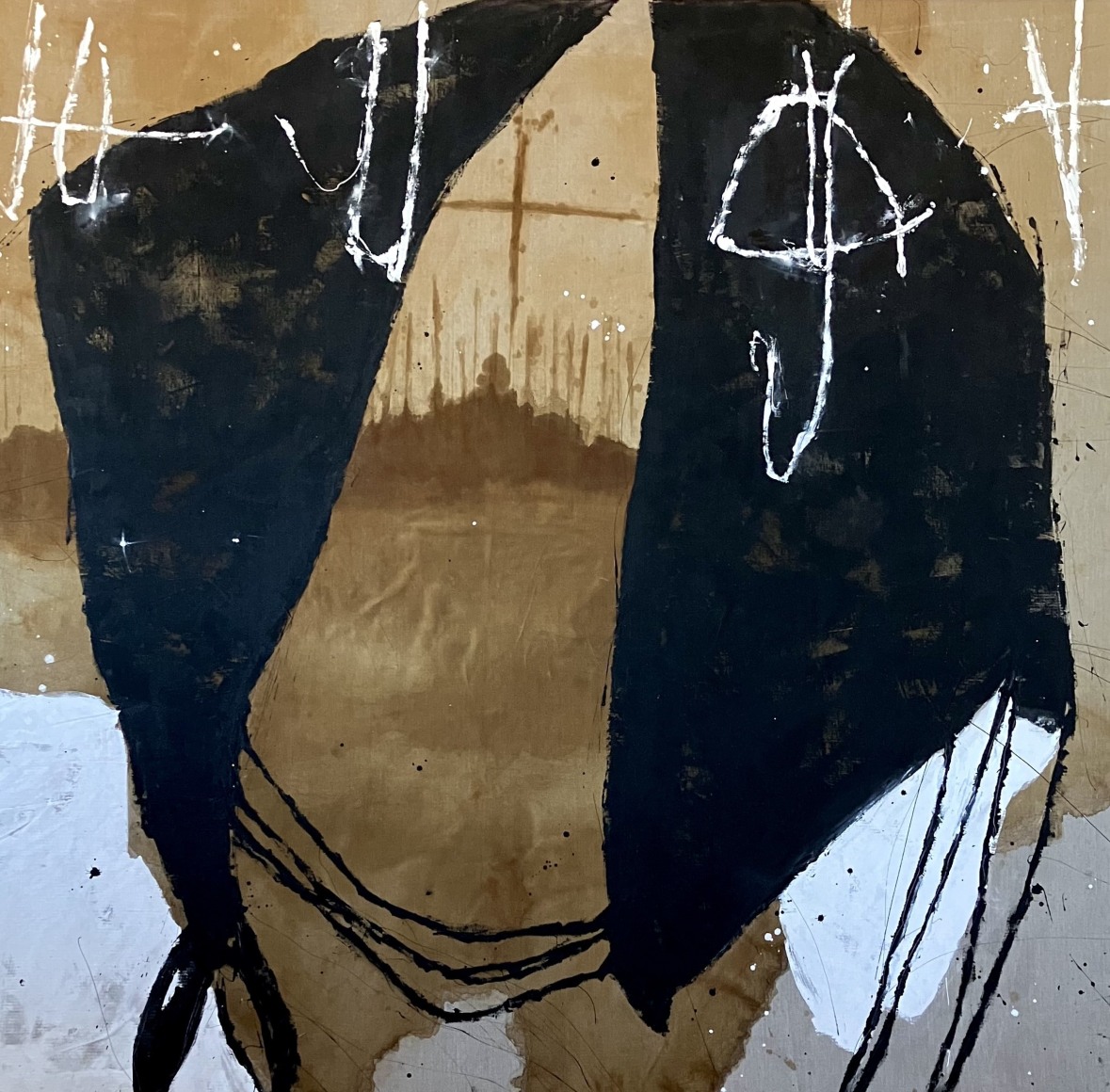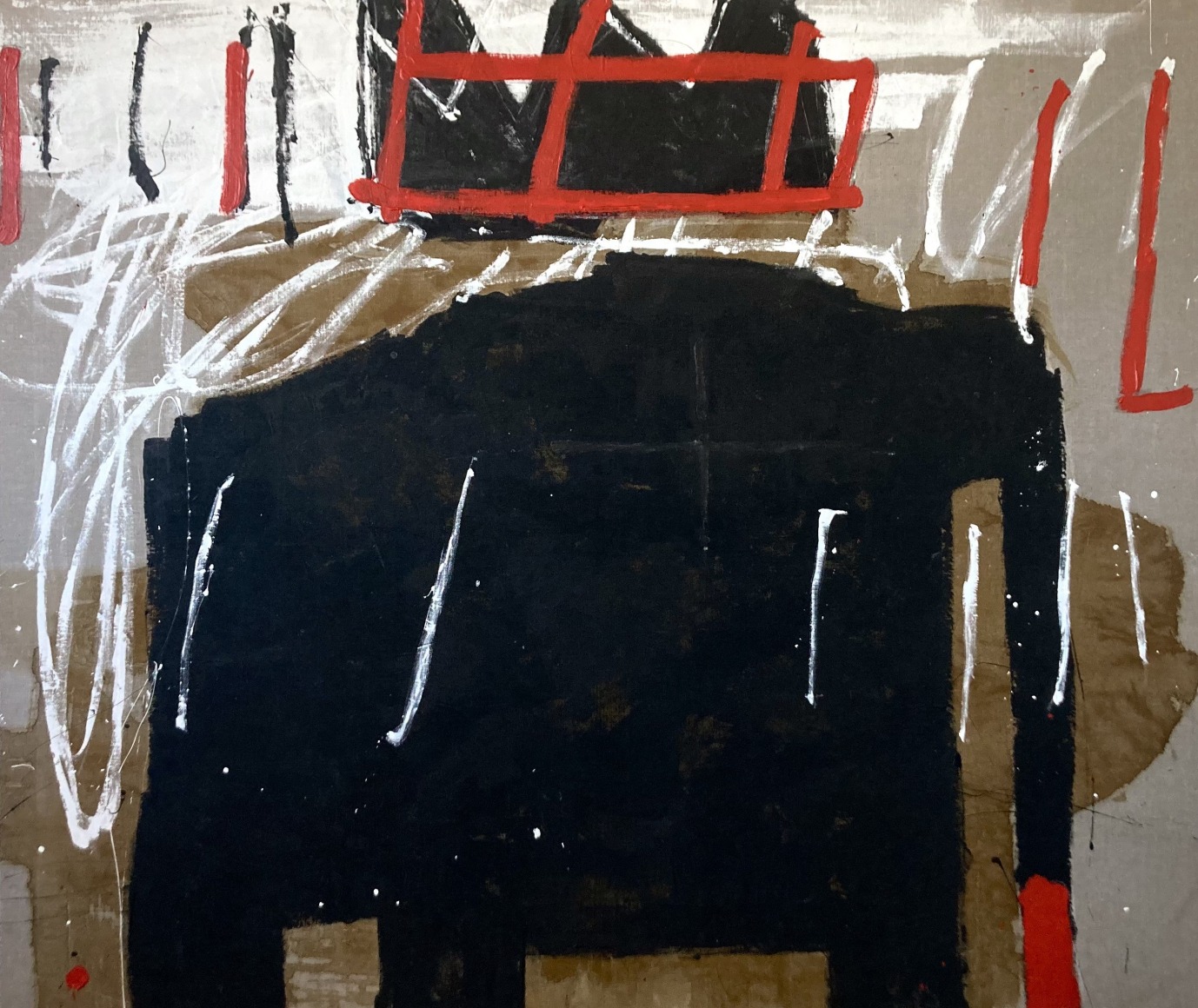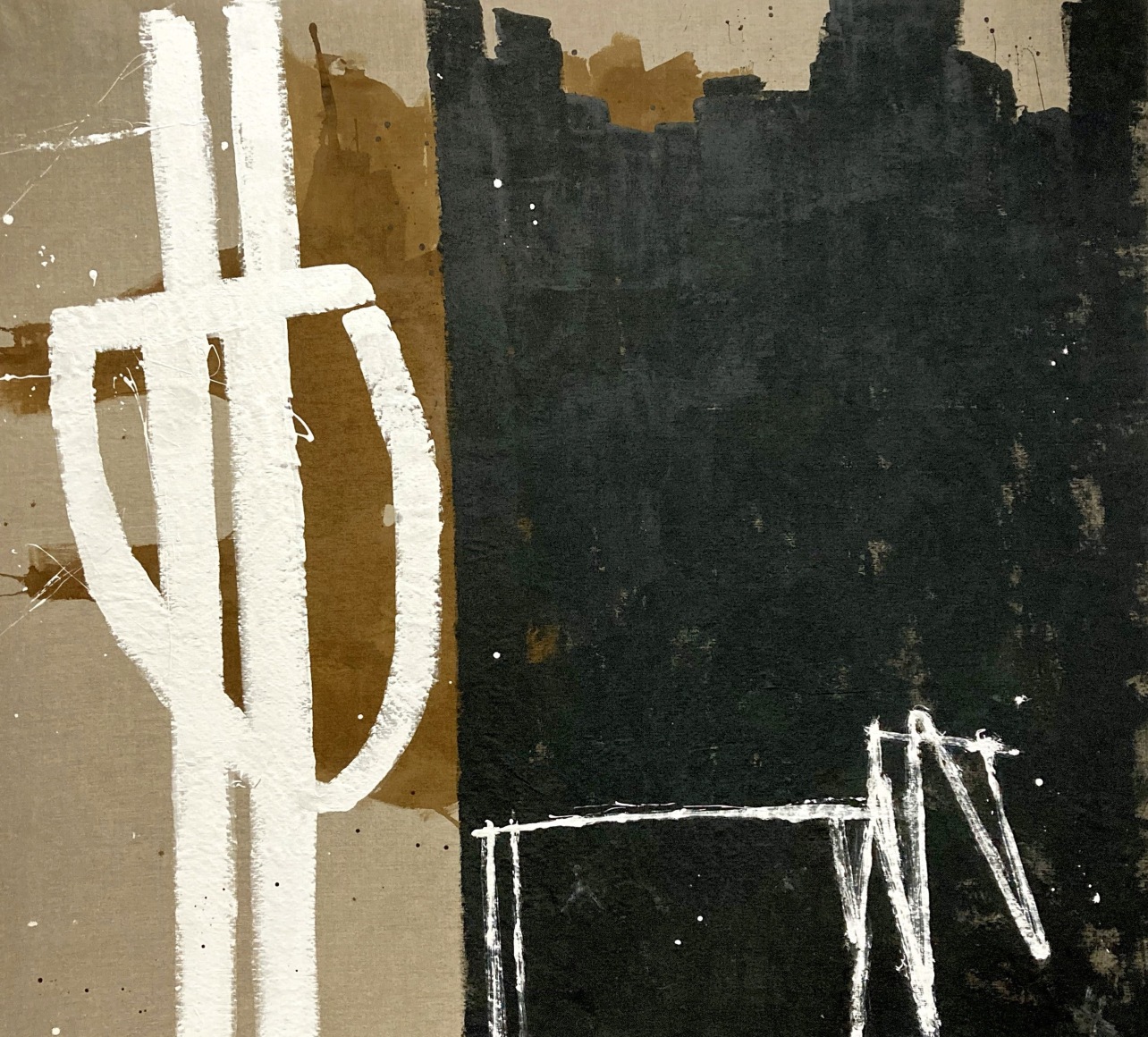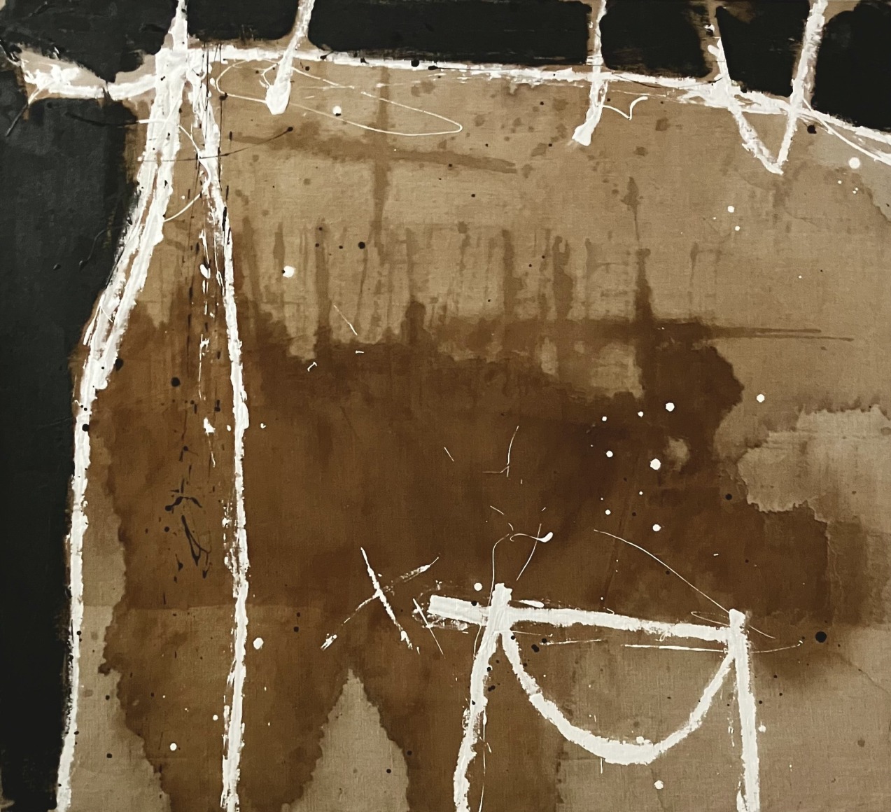 Morrison works on the floor (which adds a physicality to her process) on oversized rolls of linen or paper. While dominant forms and basic composition are often pre-determined she is relaxed with the brush, inviting the accident and instinctually rerouting course to accommodate it.