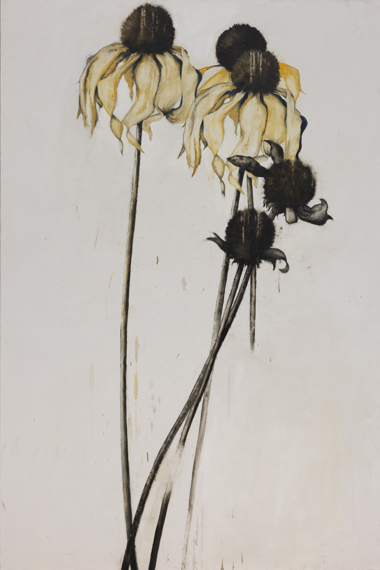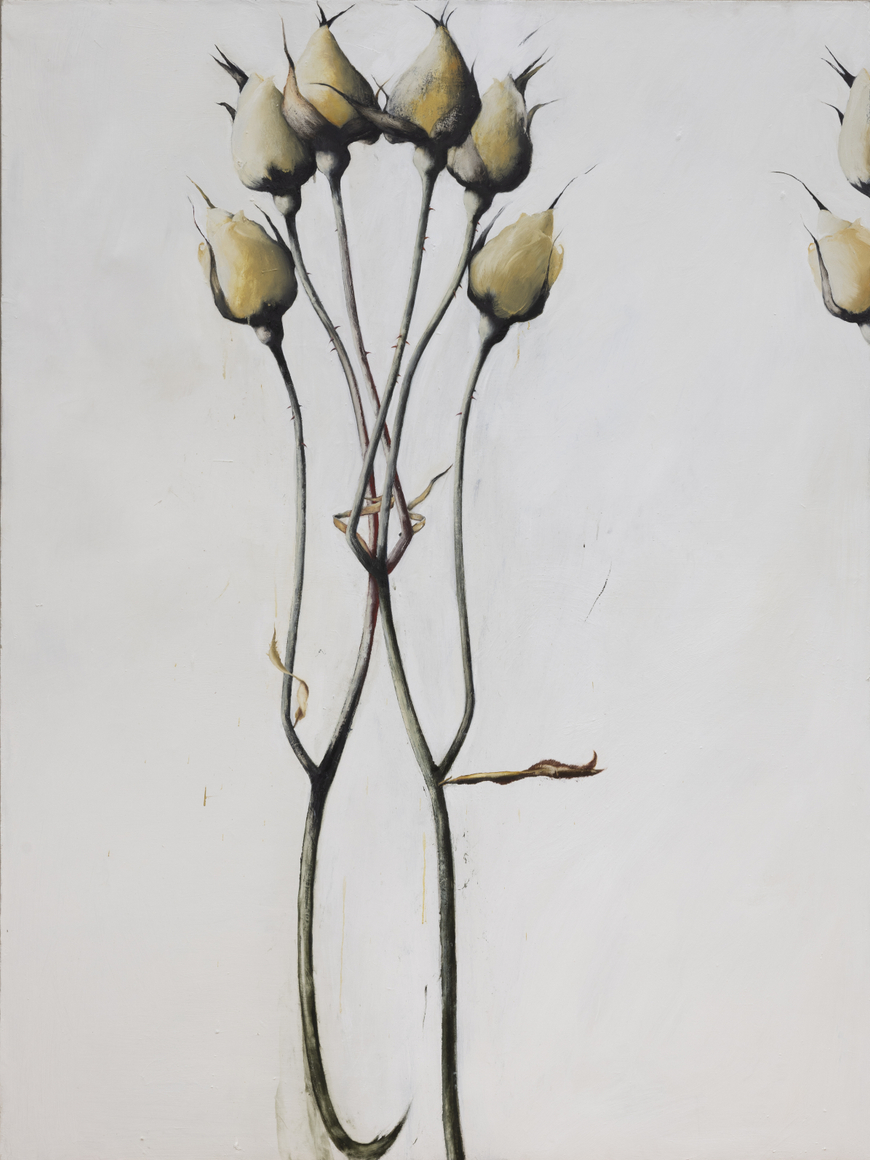 Moss is a formal painter, drawing from a deep engagement with materials, scale, surface, and composition. Through a rigorous process of delicate paint applications layered over chalk-and-oil grounds, her paintings bridge the conceptual and representational, revealing a hidden narrative that goes far beyond the minimal subject matter and expert use of negative space. Drawn to botanicals for their emotive and symbolic potential, Moss often employs images of flowers, seed pods, skeletons of pinecones and thistles as stand-ins for figures. The mysteriousness and suggestiveness of the marks we take at first blush to be the subject of a painting, are in fact beards for addressing different aspects of the human condition, dramatizing the forces of relationships: push, pull, need, love, power, isolation.